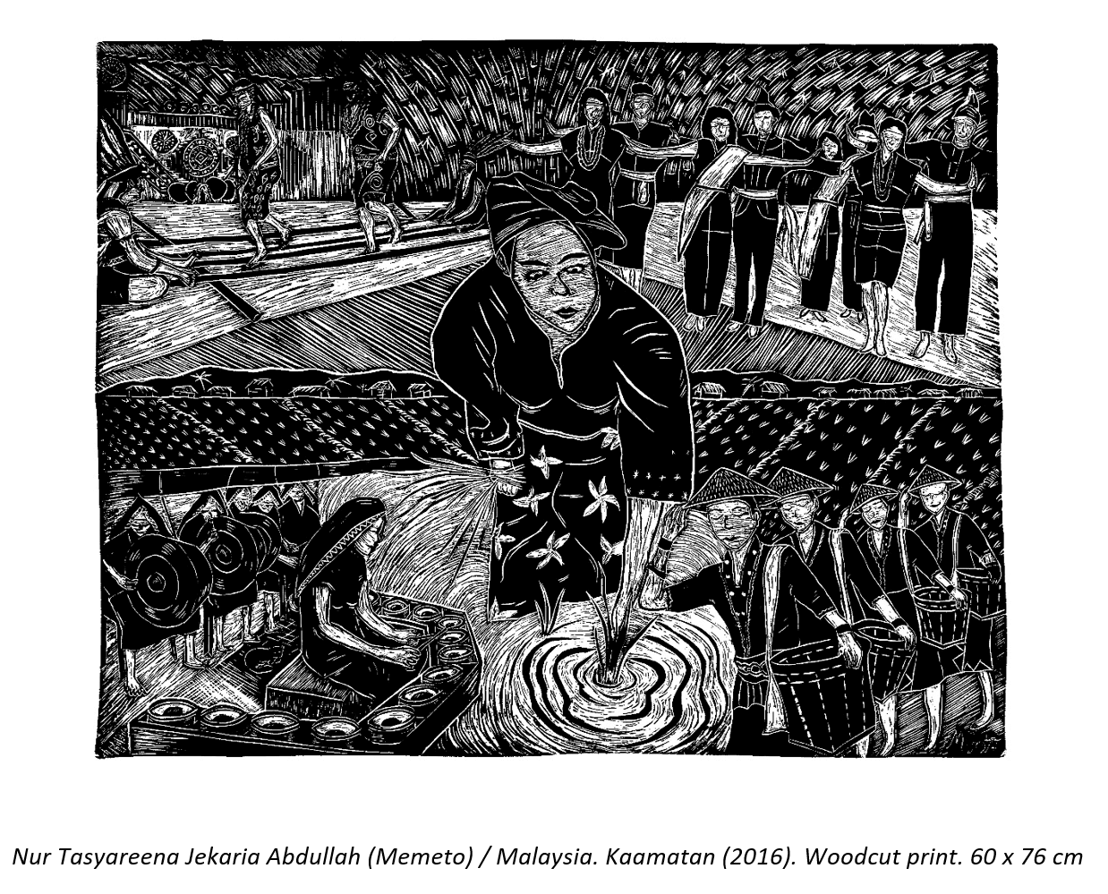 Finally questions of identity that oscillate between hope and despair are illustrated in works such as an installation by Isabella Teng Yen Lin (Singapore) that is the remnant of a hybrid art and fundraising project; a series of vignettes by Worachet Srisubal (Thailand) that represents the artist’s own meditations on the concept of hell; Siti Rawini Binti Awang Sulaiman’s (Brunei) glimpse into the social norms and customs of modern Southeast Asia; and Nur Tasyareena Jekaria Abdullah, Memeto’s (Malaysia) depiction of Kaamatan or Pesta Kaamatan, a harvest festival celebrated annually in the state of Sabah, Malaysia.