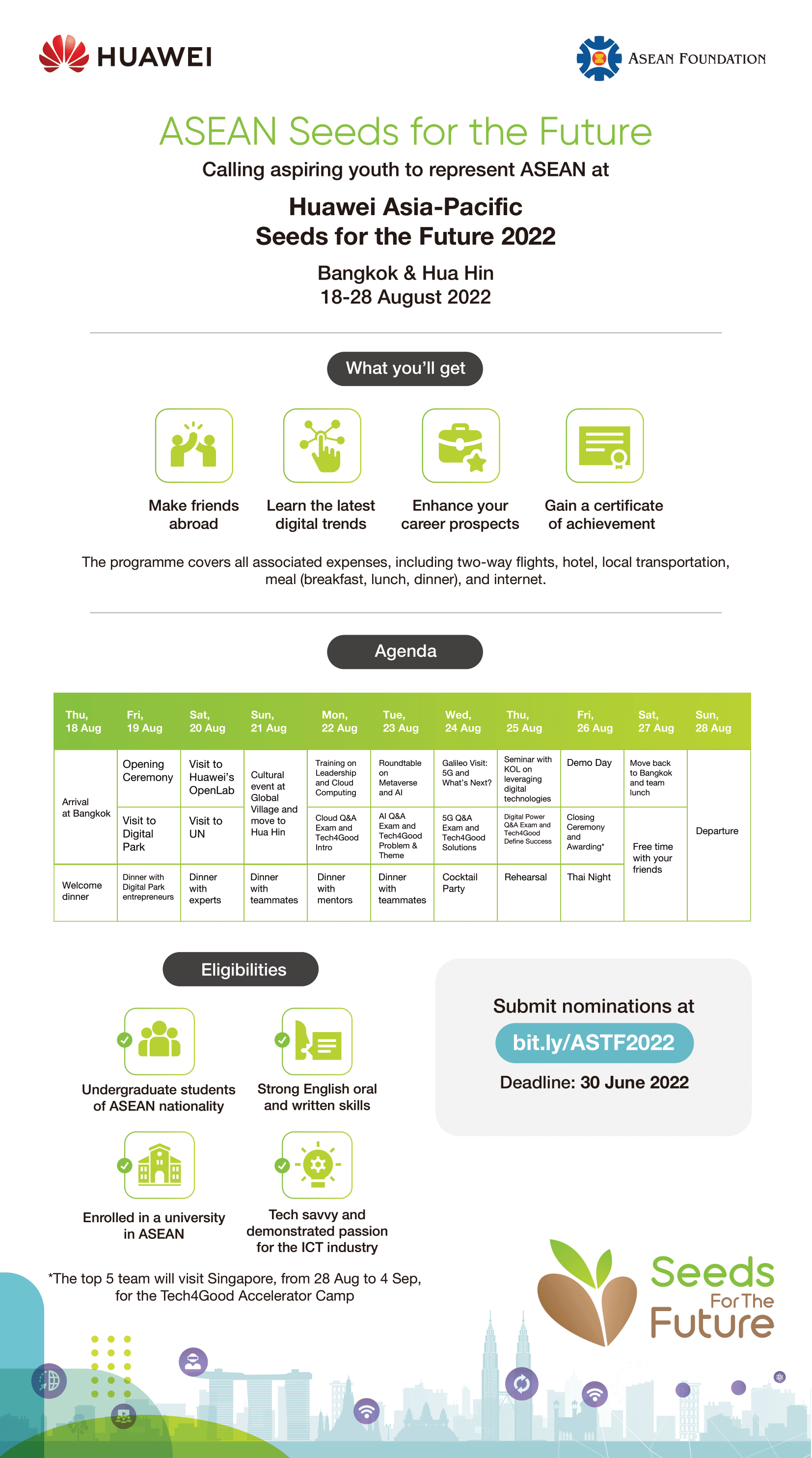 ASEAN Foundation, in partnership with Huawei, is excited to announce nominations for ASEAN undergraduate students are open on 20-30 June 2022. Aspiring youth from 10 ASEAN Member States will be selected to represent the region as youth delegates at Huawei Asia-Pacific Seeds for the Future 2022, held on-site in Bangkok and Hua Hin, on 18-28 August 2022.