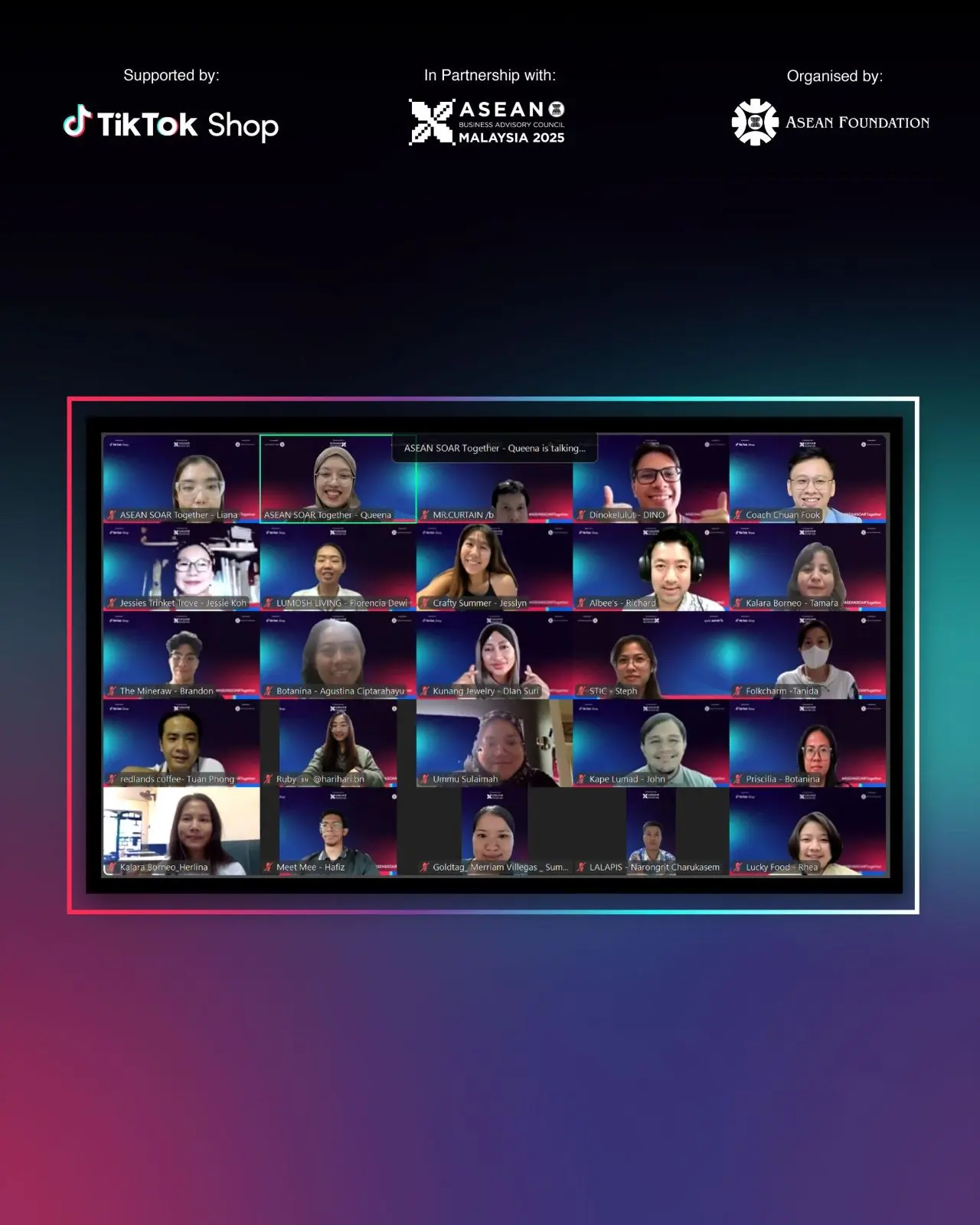 Screenshots of the ASEAN SOAR Together online capacity-building sessions featuring multiple participants and guest speakers in a virtual meeting grid. The event is supported by TikTok Shop, in partnership with ASEAN-BAC Malaysia 2025, and organised by the ASEAN Foundation.