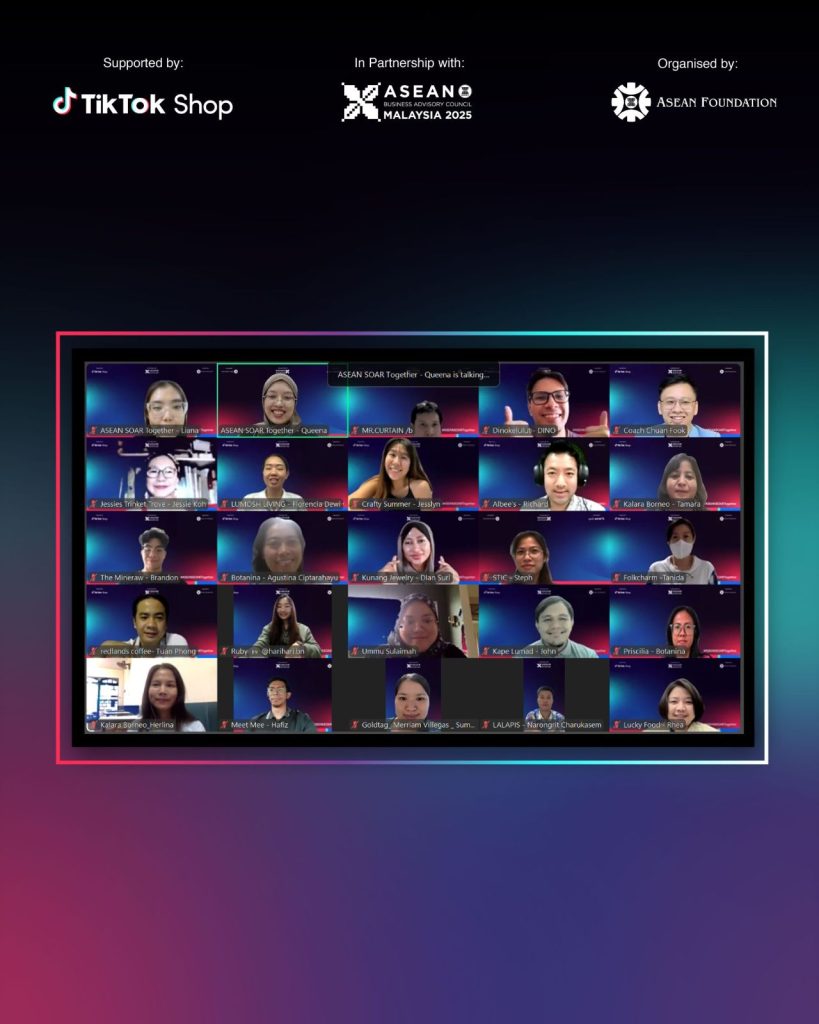 Screenshots of the ASEAN SOAR Together online capacity-building sessions featuring multiple participants and guest speakers in a virtual meeting grid. The event is supported by TikTok Shop, in partnership with ASEAN-BAC Malaysia 2025, and organised by the ASEAN Foundation. The ASEAN Foundation, in collaboration with TikTok Shop and the ASEAN Business Advisory Council (ASEAN-BAC), continued […]