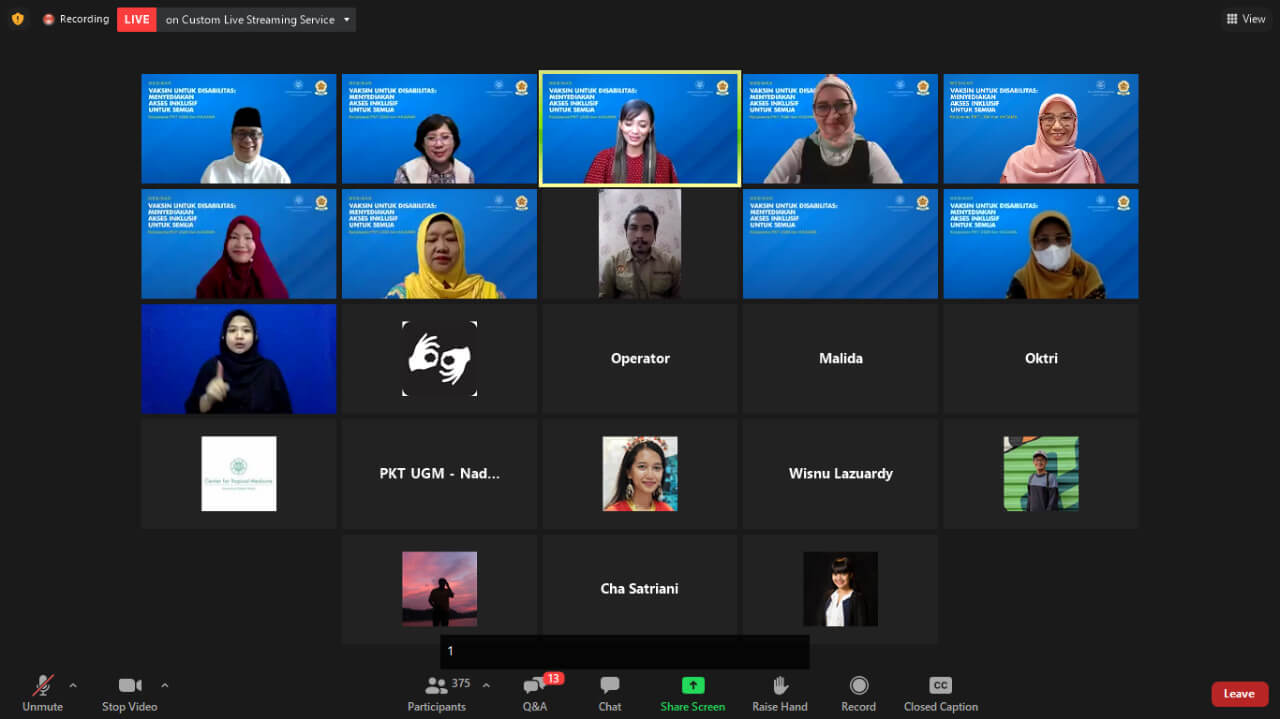 In collaboration with our workplace and KAGAMA (UGM alumni family), we held a webinar. This webinar aimed to share lessons learned from mass vaccination forPWDsin Yogyakarta. Previously, we planned to hold the webinar inviting speakers from those whowereinvolved in mass vaccination forPWDssuch as Yogyakarta Provincial Health Office, the volunteers, and the vaccine receivers.However, when KAGAMA joined the team, this webinar became bigger. We invited The Minister of Social Affair,IbuTriRismaharini, the president staff,Mr.AriDwipayanaandMs.AngkieYudistiaas keynote speakers. From this webinar, around 35 online media wrote news about vaccination forPWDs. It was expected that other provinces or districts would be triggered to provide inclusive services for vaccination forPWDs.